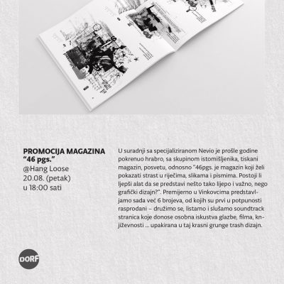 Zbog tehničkih problema, najavljenu za petak – promociju sjajnog magazina “46pgs.” održat ćemo dan prije – u četvrtak 19.08. u 19 sati, u baru Hang Loose u 18:00 sati.