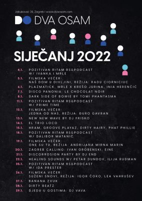 Za kraj ove uzbudljive godine, imamo dobre vijesti. U suradnji sa Pozitivan ritam d.o.o. nastavljamo sa filmskim projekcijama u Zagrebu. U novom klubu Dva Osam (nekadašnja Jabuka) srijedom organiziramo filmski program.