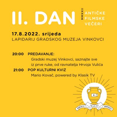 Drugi dan, srijeda 17.kolovoza, počinje kratkim – uvijek zanimljivim – predavanjem s novostima iz Gradskog muzeja Vinkovci, već tradicionalno predstavljanje ovogodišnjih rezultata i najava arheoloških radova u drugom dijelu godine. Odmah nakon toga, filmsko-glazbeni kviz powered by Klasik TV vodi poznati kvizaš Mario Kovač – kazališni redatelj, performer, DJ, glumac, doktor znanosti, scenarist, šahist, strastveni pub kvizaš. Prijavite se u ekipi 2 do 4 člana prije početka kviza, nema kotizacija.